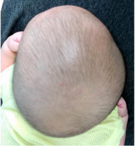 Pemipihan pada bagian belakang kepala, menyebabkan belakang kepala terlihat datar/rata dan lebih tinggi.